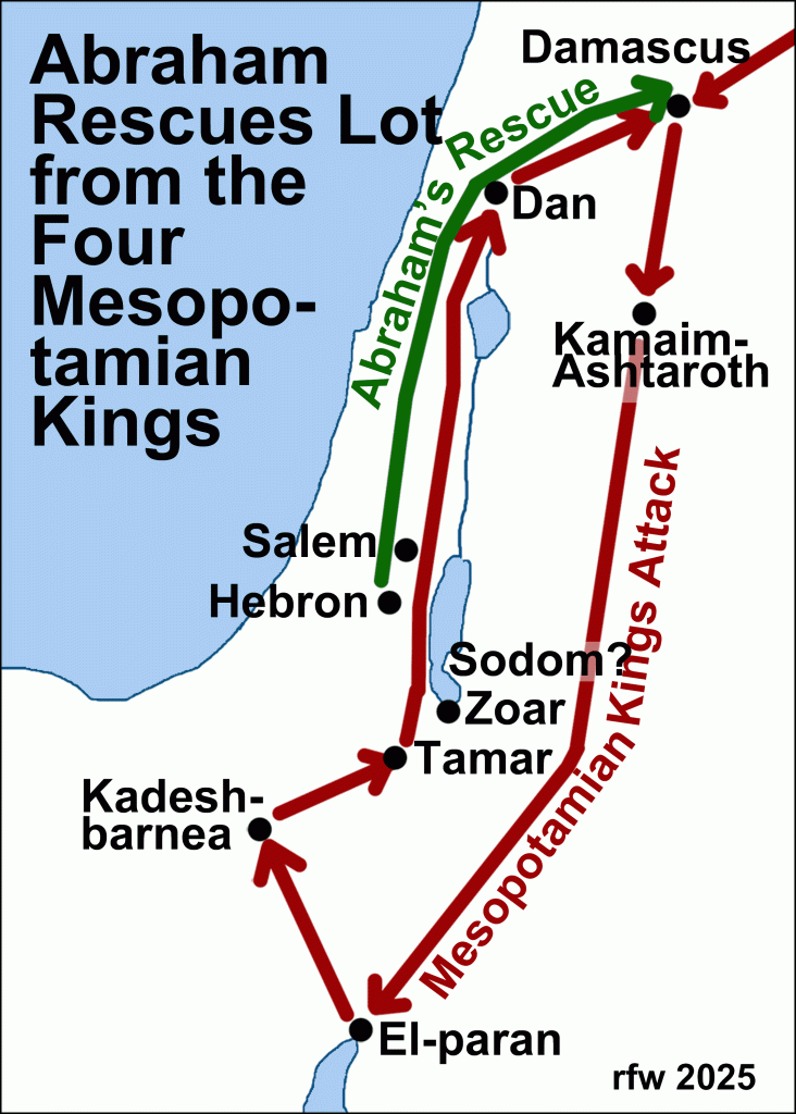 Kings from the east and north of Palestine, modern-day Iraq, Iran, and Turkey, were attacking kings in the Palestine region who rebelled against them. “For twelve years they had been subject to King Kedorlaomer, but in the thirteenth year they rebelled against him.” (Gen.12:4 nlt) Their campaign went through the eastern side of the Jordan from beyond Damascus as far south as the Dead Sea and northward along the western side of the Jordan Valley. They were met by the rebel kings of Sodom, Gomorrah, Admah, Zeboiim, Bela (also called Zoar) and they were prepared for battle.