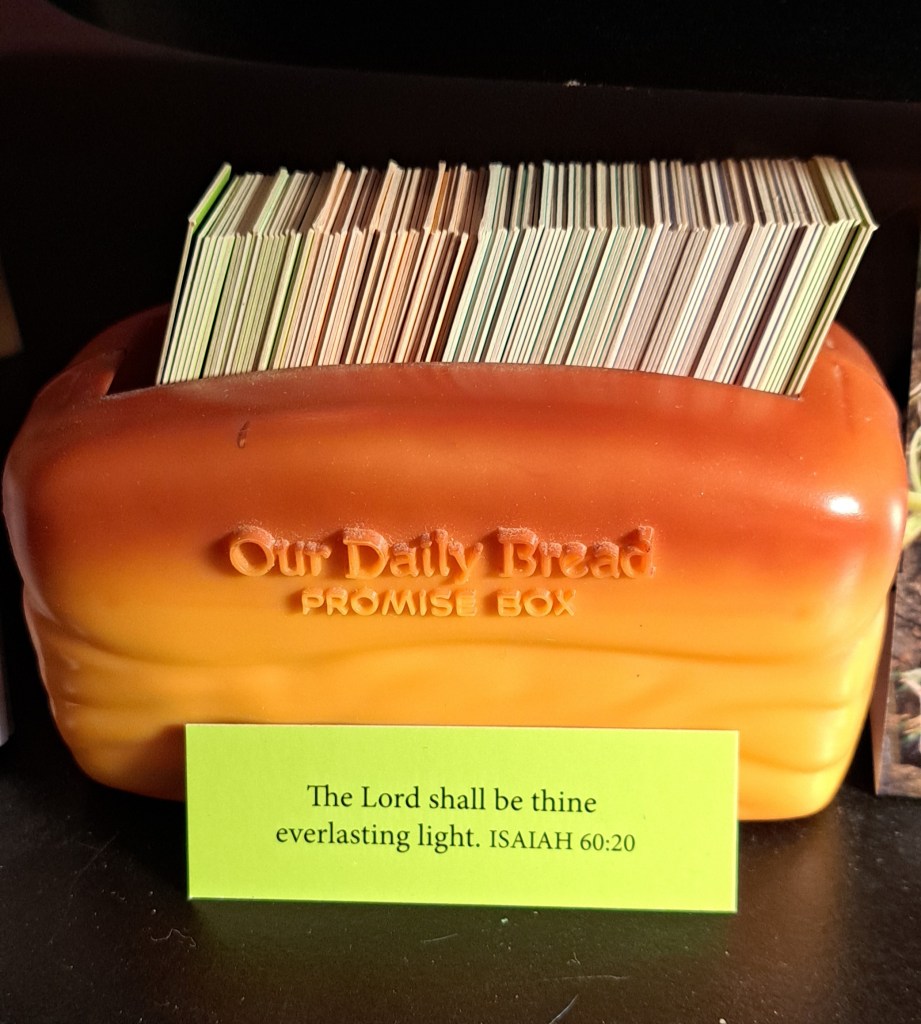 I have a ‘promise box’ sitting on my desk. It was a Christmas gift from a neighbor a few years back, a little plastic box in the shape of a loaf of bread with ¾ x 2 ¾ inch cards with a daily Bible verse printed on both sides. It’s called a ‘promise box’ because it contains God’s promises right from Scripture. The daily bread we need to sustain us in our spiritual walk each day is found in every verse pulled from that bread box. The card I pulled out today contained the following verses, “The Lord shall be thine everlasting light.” (Is.60:20 kjv) and “The Lord thy God…keepeth covenant and mercy with them that love Him.” (Dt.7:9 kjv)